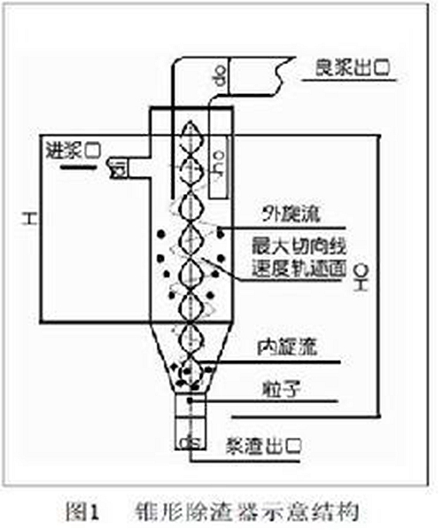漿泵將紙漿輸送至重物除渣器的螺旋入口(進漿口一般在重物除渣器中上部)時,使紙漿通過旋轉(zhuǎn)產(chǎn)生的離心力將紙漿內(nèi)較重的物體(如鐵釘、石塊、訂書針、沙子等)分離至(重物除渣器下部)有水的罐體內(nèi),因為下部罐體內(nèi)的水壓將懸浮在罐內(nèi)上部的良漿逼迫至(重物除渣器的上部)出口后通過輸送管道輸送至其它設(shè)備或漿池內(nèi)。